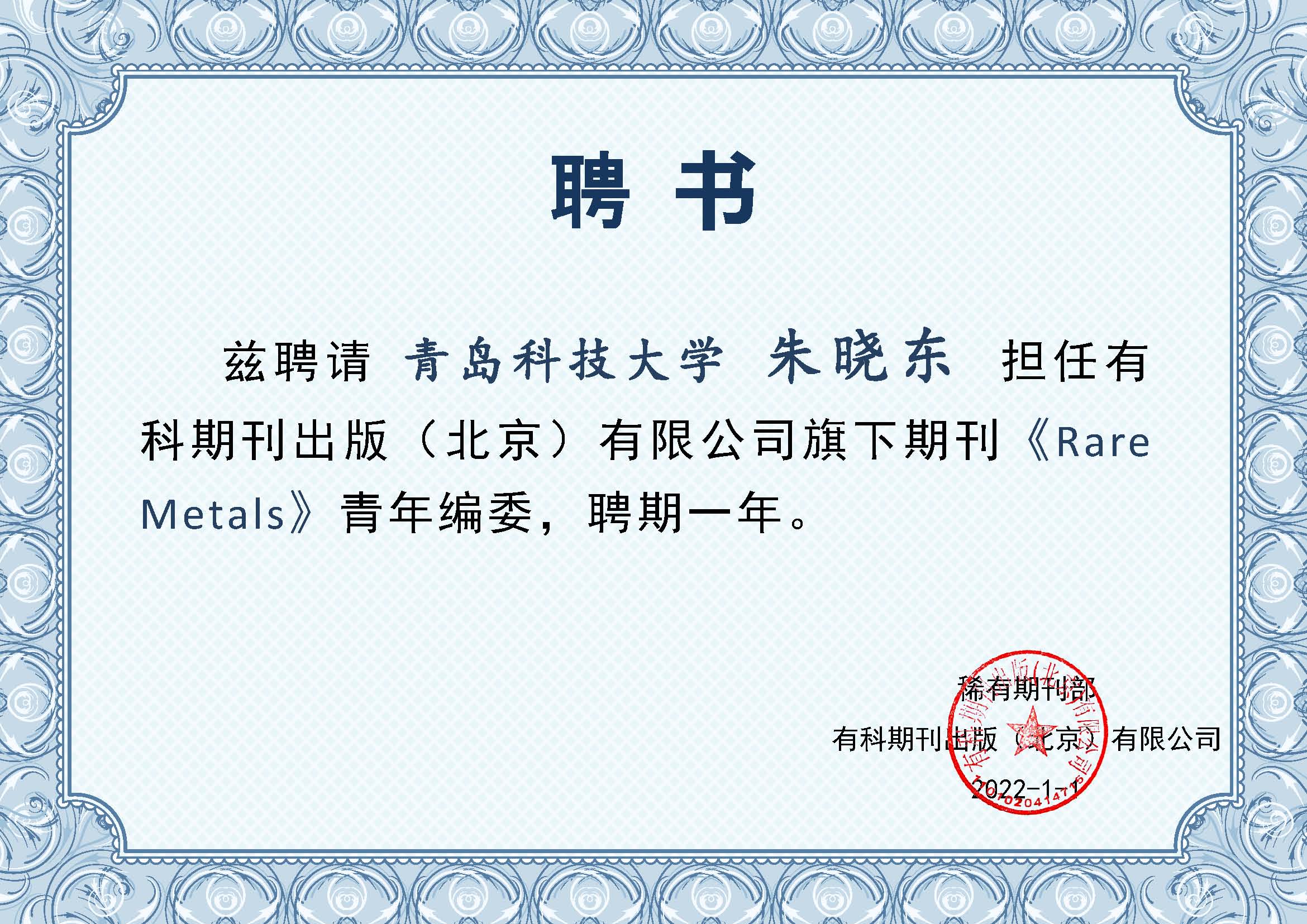 2022.1 - 至今   《Rare Metals》青年编委